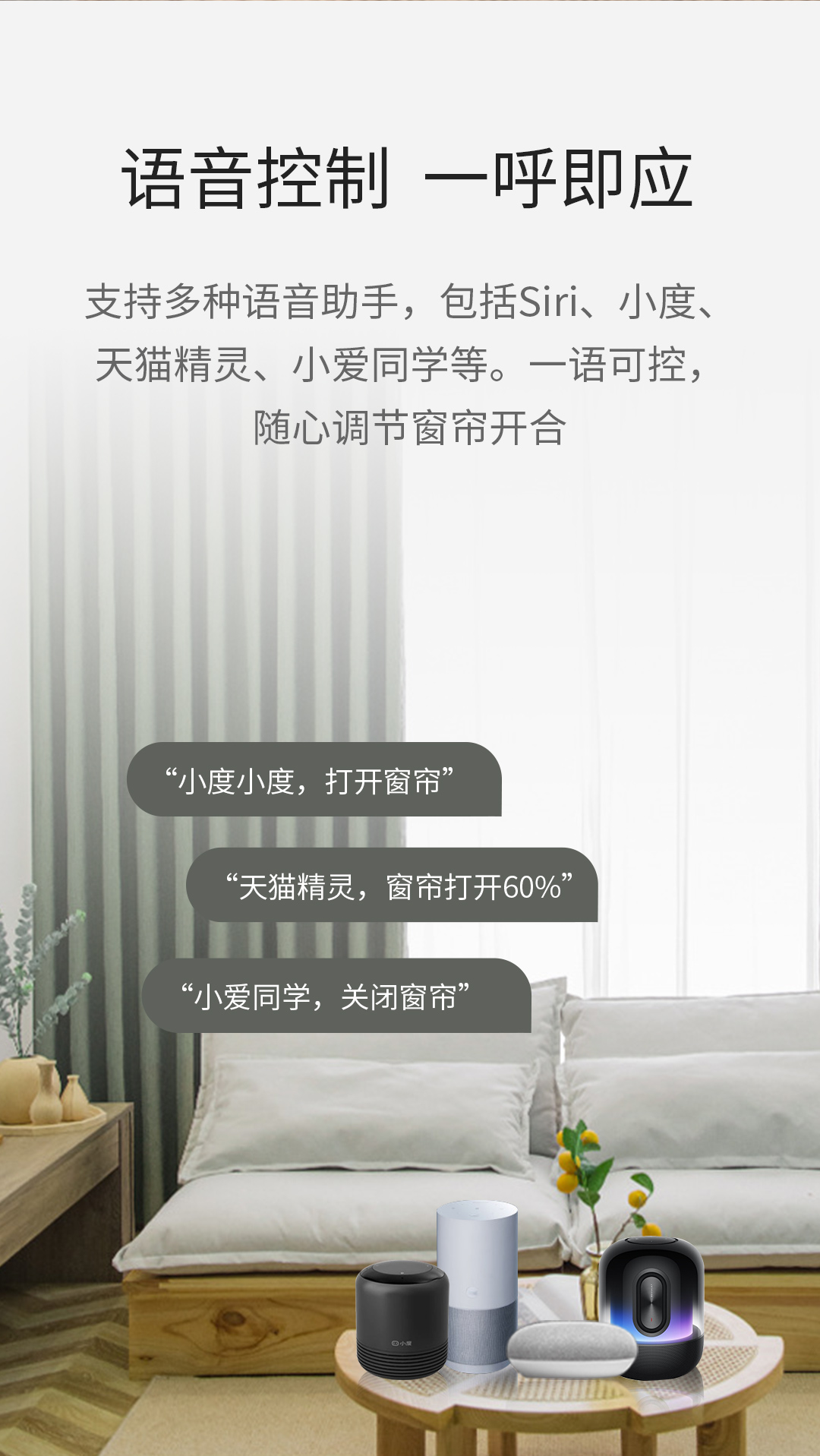 控制方式:重力感應(yīng)遙控器、智能手機(jī)APP、場(chǎng)景控制,沒(méi)電狀態(tài)下可采用手拉模式,超靜音設(shè)計(jì),自然感受光感,體驗(yàn)智能快樂(lè)。
