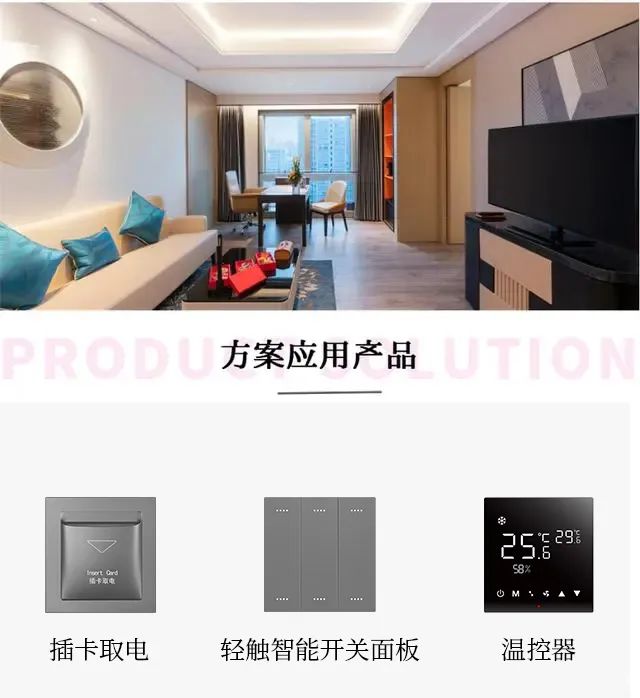 住客可以通過語音/面板按鍵/小程序控制酒店客房內(nèi)的燈光/窗簾/空調/電視等;輕觸床頭開關面板,隨心所欲一鍵切換明亮模式、閱讀模式、睡眠模式等智慧場景模式。