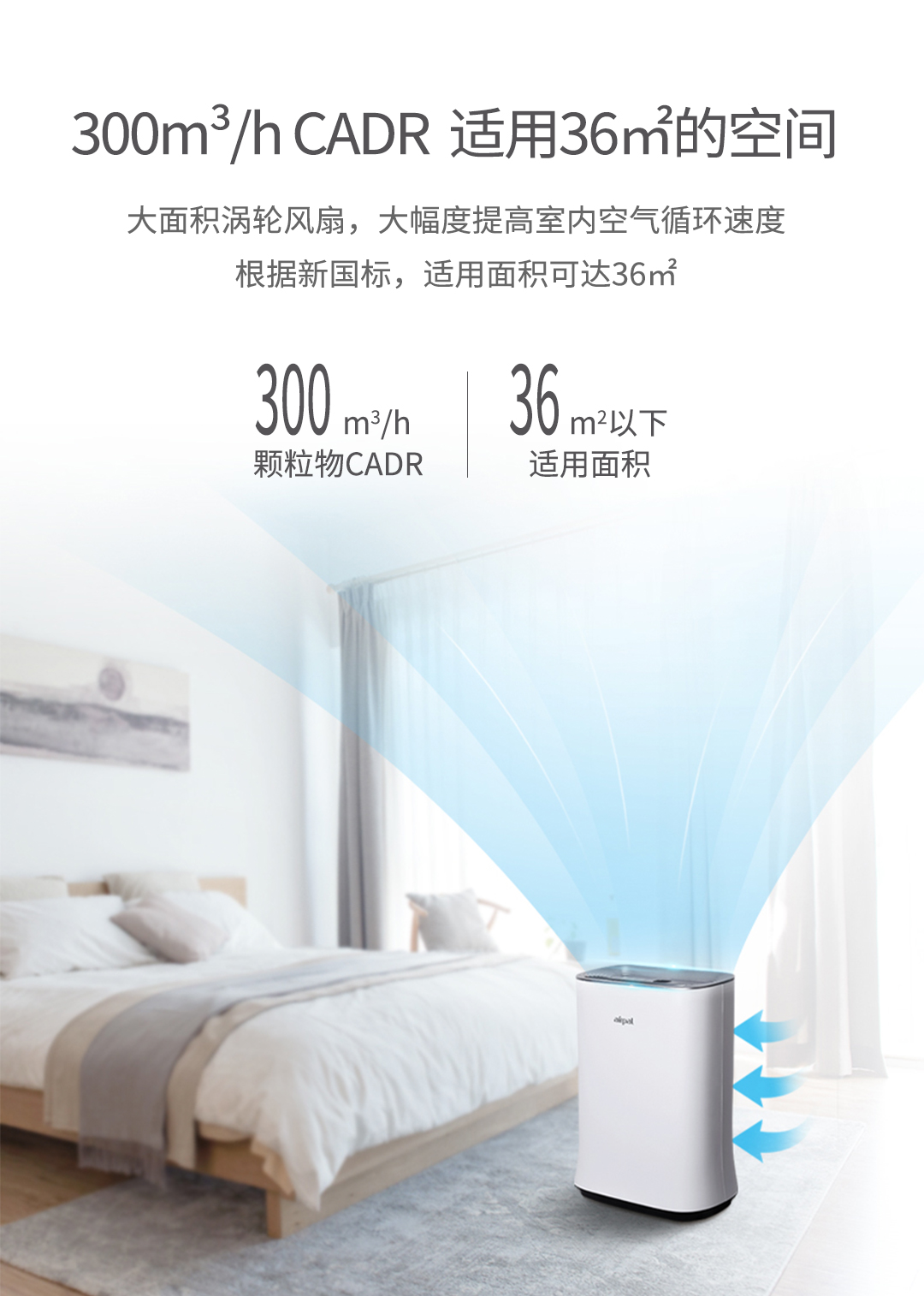 根據(jù)空氣動(dòng)力學(xué)原理設(shè)計(jì)出循環(huán)風(fēng)道的結(jié)構(gòu),300m3/hCADR,潔凈的空氣經(jīng)由兩側(cè)的高效風(fēng)機(jī)引擎,大面積渦輪風(fēng)扇進(jìn)行進(jìn)風(fēng)和送風(fēng)的加速,通過上方的獨(dú)立風(fēng)道送出,大風(fēng)量主動(dòng)凈化空氣中的污染物空氣從上方360°四散流動(dòng)至墻壁、地面,使用面積可達(dá)36㎡極速凈化各個(gè)空間,帶來雙倍潔凈風(fēng)量。