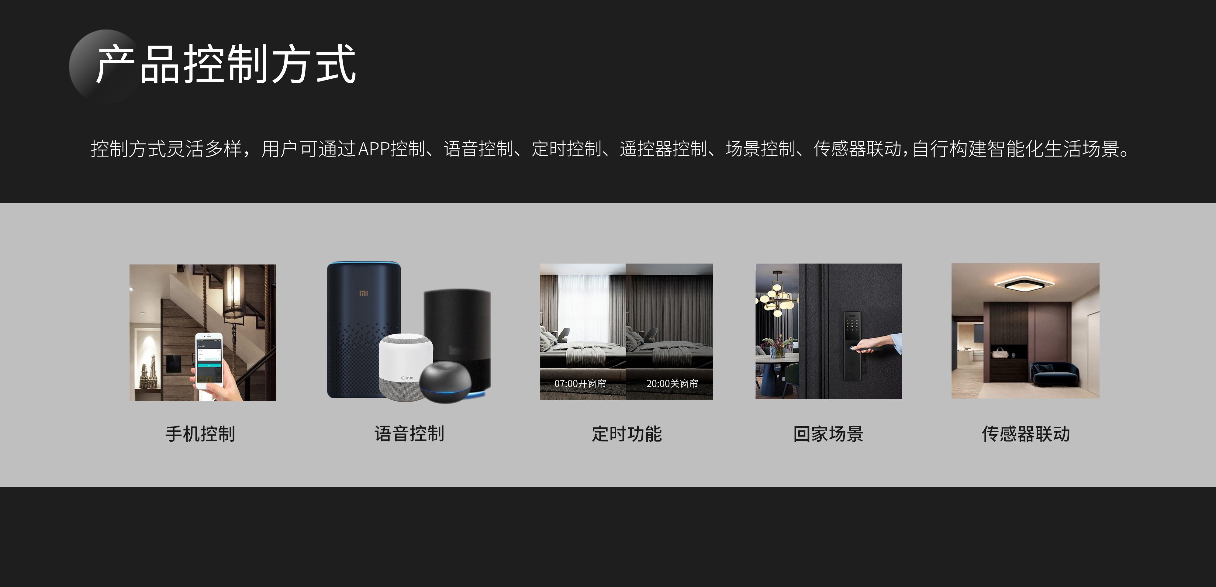 我們整套系統(tǒng)有多種控制方式:APP控制、語音控制、定時控制、遙控器控制、場景控制、傳感器聯(lián)動。