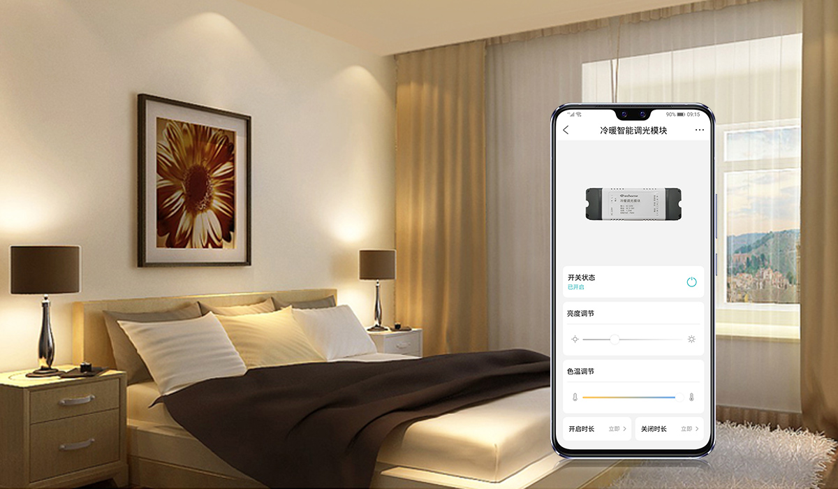 如果想要調(diào)節(jié)燈光的色溫,可以選擇冷暖調(diào)光模塊。它可以搭配筒燈使用,調(diào)節(jié)多種燈光模式,比如冷色和暖色等。還可以根據(jù)場景和需求,在APP中設(shè)置延時(shí)控制,實(shí)現(xiàn)更豐富的場景體驗(yàn)。