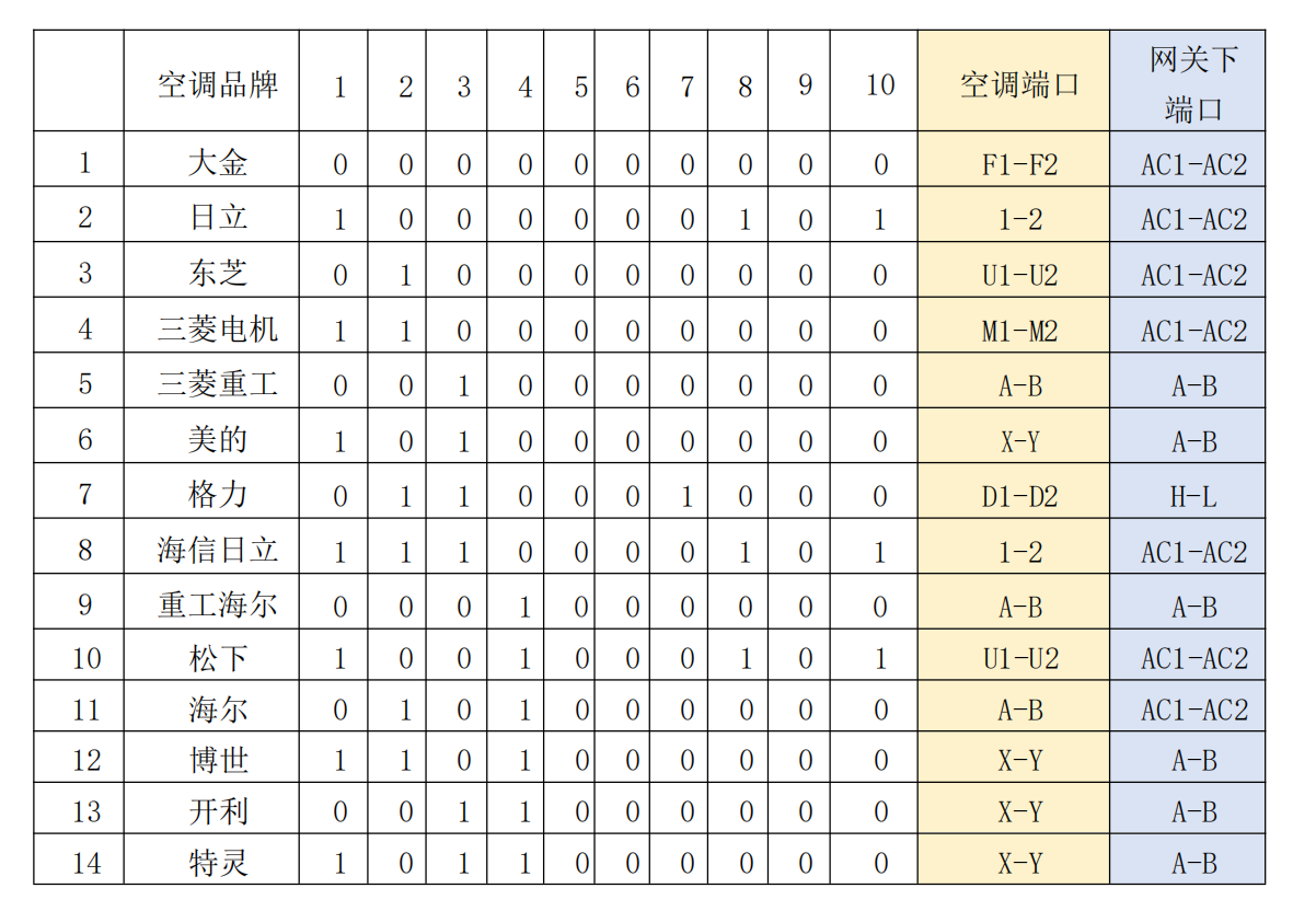 撥碼及通訊線的接入主要根據(jù)中央空調(diào)的品牌進行確定,具體要求參考下方圖表說明:0為OFF不用撥;1為ON,向上撥碼。出廠狀態(tài)為全0。