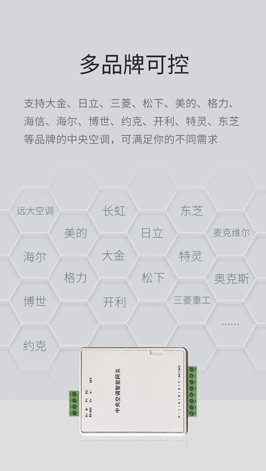 中央空調(diào)智能網(wǎng)關(guān)支持大部分主流空調(diào)品牌,包括大金、日立、三菱、松下、美的、格力、海信、海爾、博世、約克、開利、特靈、東芝等,滿足客戶的不同需求。