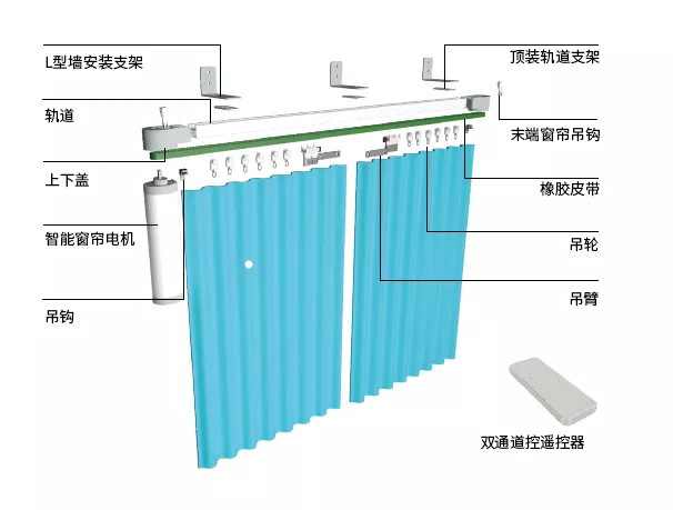 安裝配件:L型墻安裝支架、頂裝軌道支架、軌道、末端窗簾吊鉤、上下蓋、橡膠皮帶、智能窗簾電機、吊輪、吊鉤、雙通道遙控器