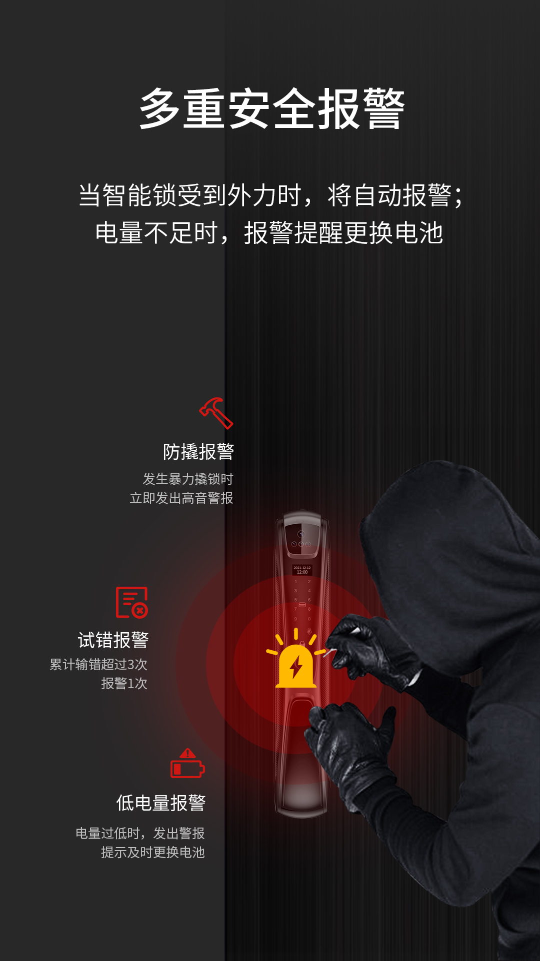 智匯云的這款智能門鎖,將安全屬性融入到產品的每個細節(jié),用心不僅體現在功能上更體現在選材上。智能門鎖采用的C級防盜鎖芯,能夠有效防暴力拆卸及撬鎖,安全系數高。
