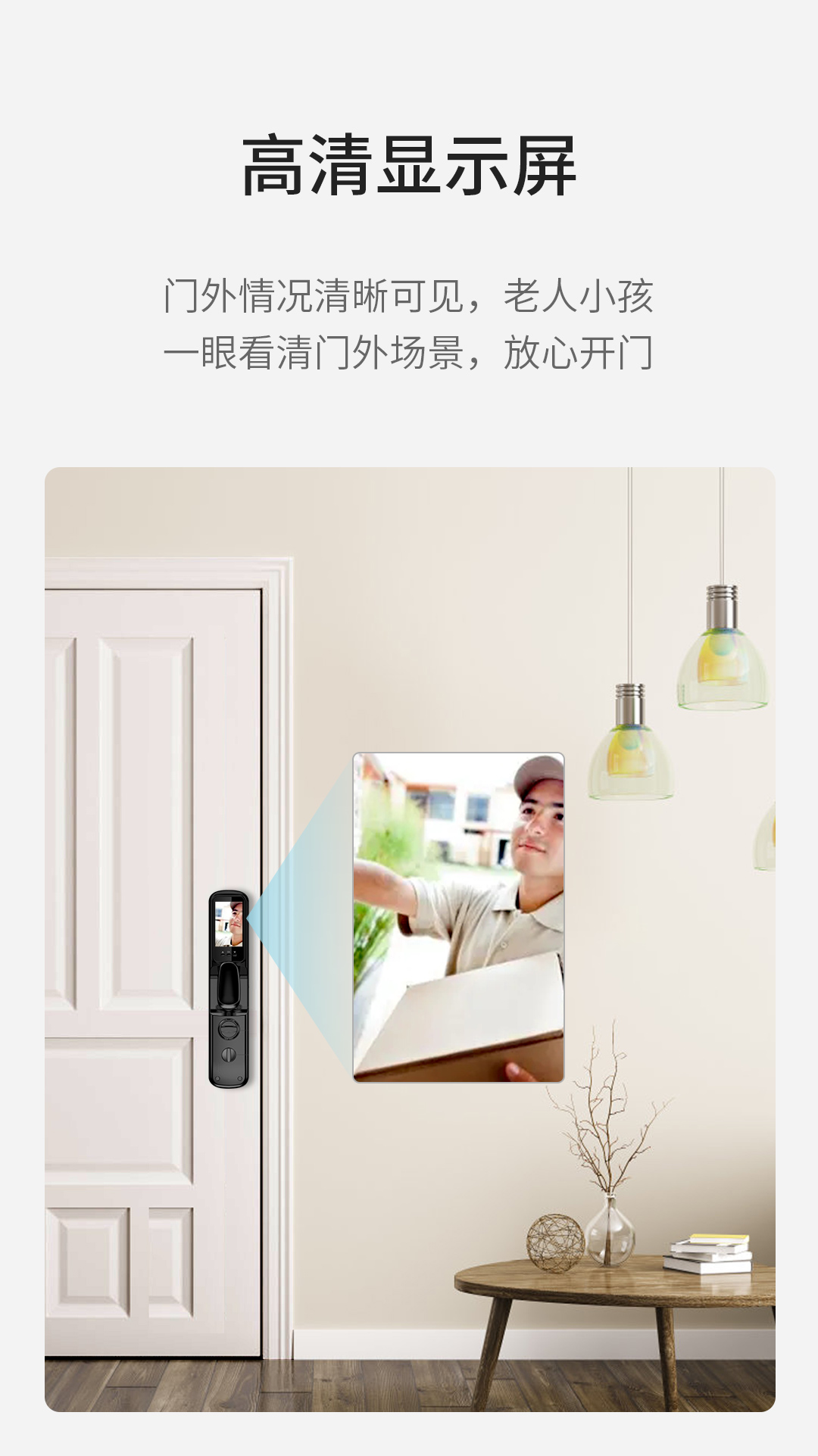 如果聽見有人敲門或門外有異響,通過門鎖的貓眼及時查看門外狀況。同時,智能門鎖上的高清顯示屏也將同步顯示門外情況,老人小孩在家就能看清門外的場景,讓居家安全多一份保障。
