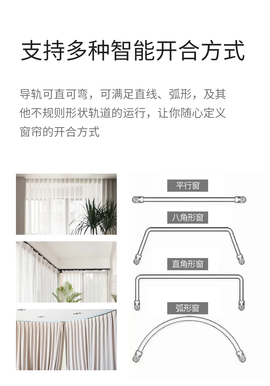 智匯云智能窗簾滿足單邊、雙邊開合方式,兼容直軌、弧型、L型等多種軌道安裝環(huán)境,支持異型軌道定制,可根據(jù)家中窗戶的形狀定制相應(yīng)軌道。