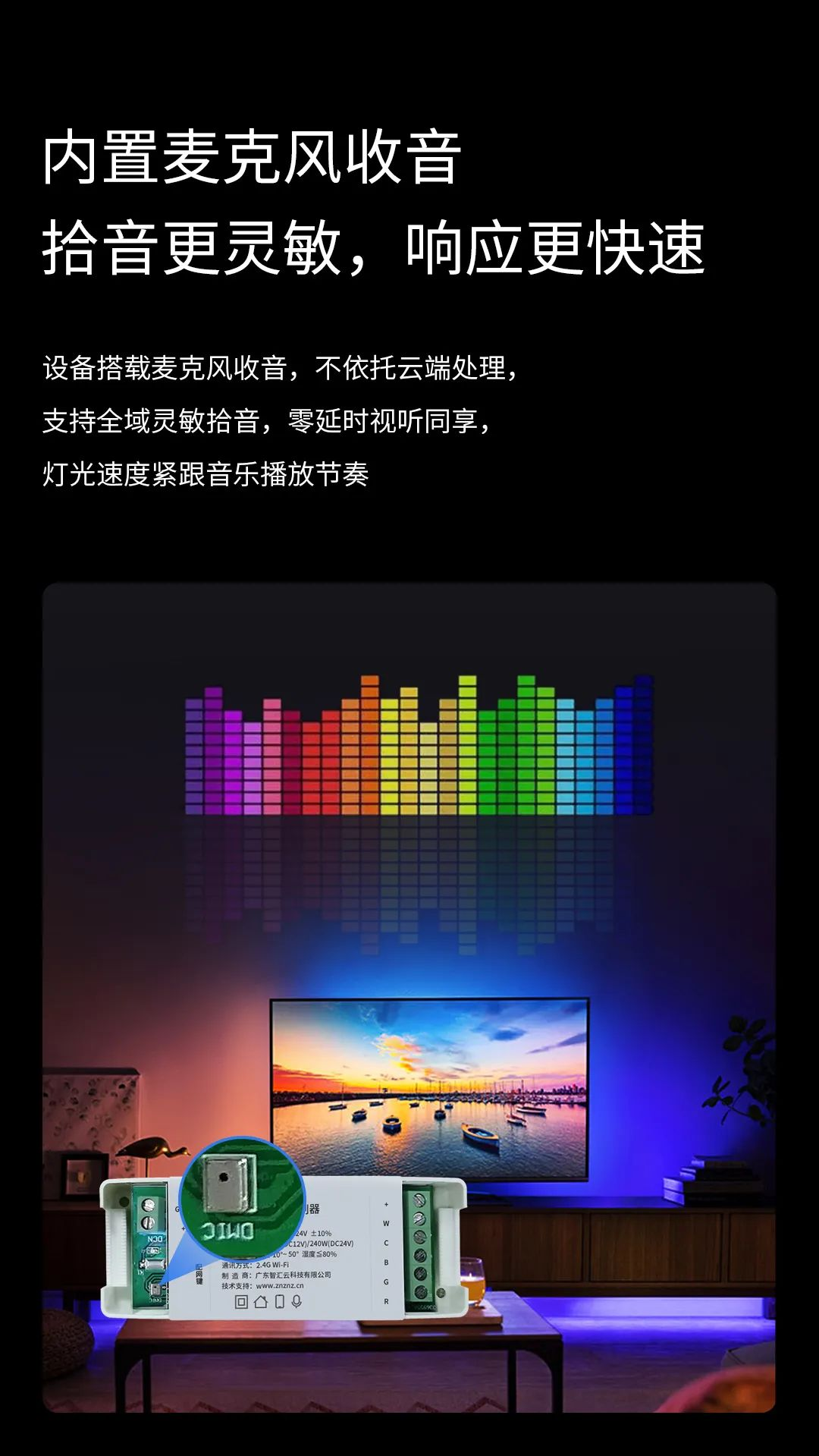 區(qū)別于市面上大部分通過手機話筒拾音的調光控制器,控制器內置微型麥克風拾音,精準識別音樂的變化而發(fā)出指令,使燈帶隨著音樂的律動變換色彩。