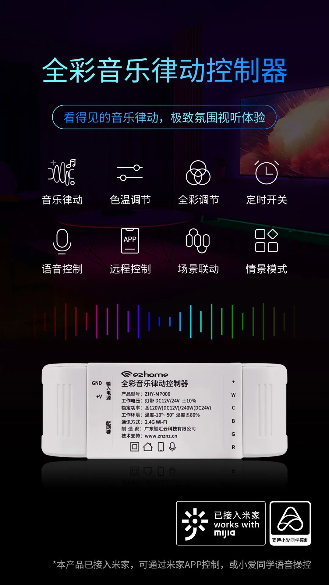 智匯云重磅推出全新產品全彩音樂律動控制器,接入米家生態(tài),搭配燈帶使用,支持調節(jié)燈光顏色、色溫和亮度,燈光色彩隨音樂律動,輕松實現聲控發(fā)光,營造出適合不同生活情景的燈光氛圍。