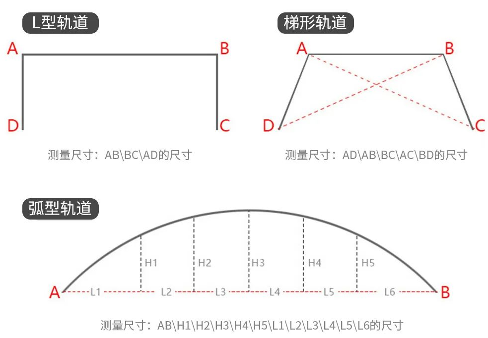 不規(guī)則的軌道在測量的時候就需要測量多幾個尺寸,比如單軌L型、梯形、弧形等。
