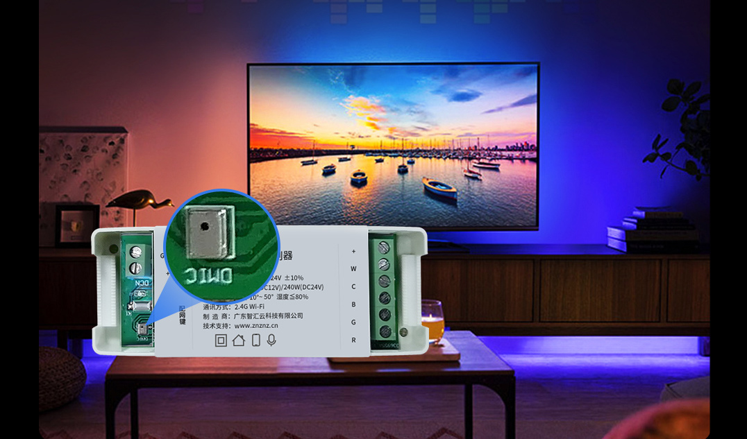 和大部分只能控制燈光冷暖色溫或RGB調(diào)色的調(diào)光模塊不同,本產(chǎn)品的最大亮點(diǎn)是支持“音樂律動”功能,通過控制器內(nèi)置的微型麥克風(fēng)智能拾音,對聲音更加靈敏,光隨聲動。