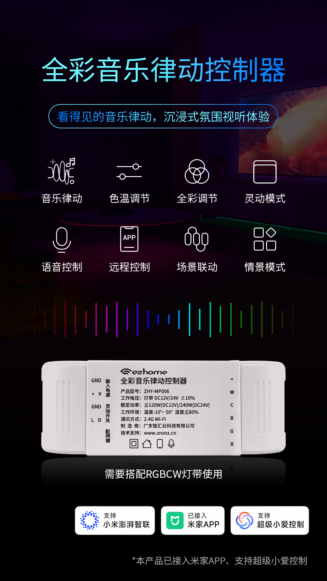 智匯云新品全彩音樂律動控制器已接入米家APP,可以和其他接入米家的產(chǎn)品互聯(lián)互動,打造更加豐富的應(yīng)用場景,滿足用戶多種照明需求,打造更加全面的光環(huán)境。