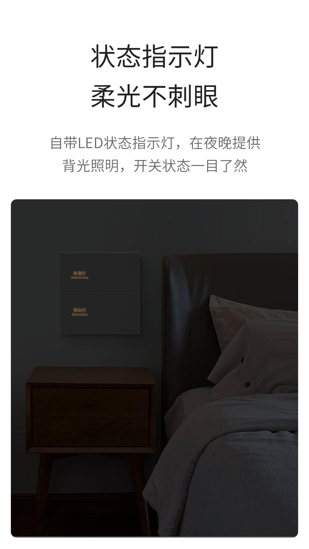 內(nèi)置LED狀態(tài)指示燈,實時反饋開關狀態(tài),在夜晚發(fā)出微微亮光,輕松找到開關位置。
