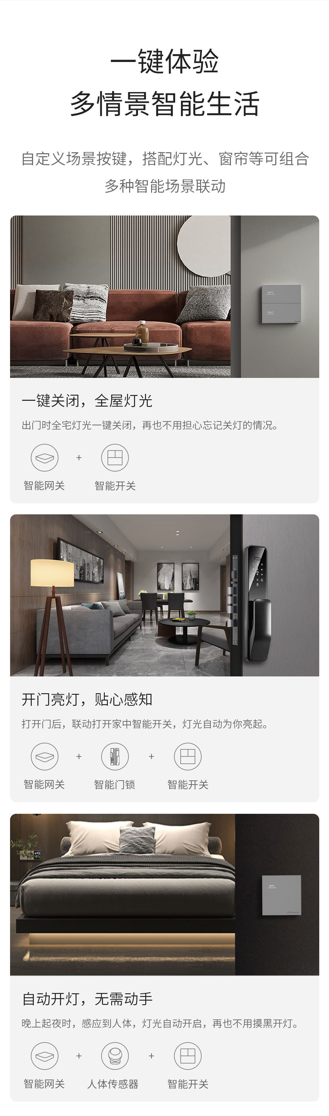一鍵智能場景控制:聯(lián)動家中其他智能設備,一鍵開啟智能場景聯(lián)動,實現(xiàn)家居生活場景的多樣化。