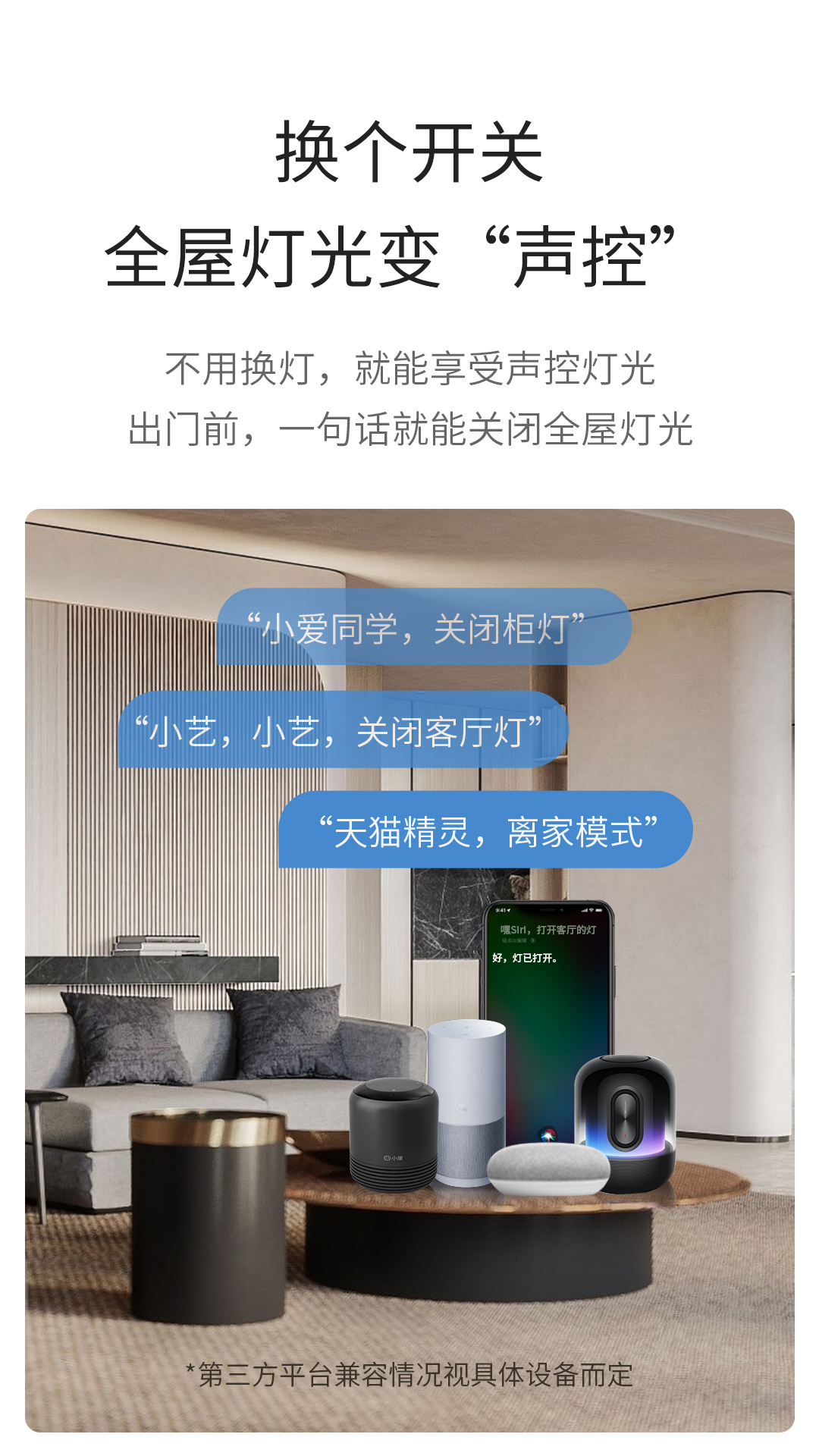 一呼即應語音控制:支持連接華為小藝、小愛同學、天貓精靈、百度小度等第三方智能音箱,輕松一句話,讓開關燈更省心。