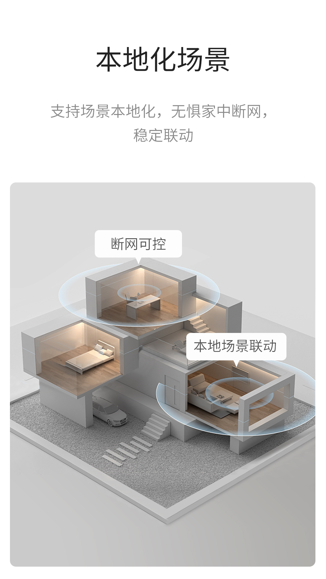 本地場景:需要網(wǎng)關,但不受網(wǎng)絡限制,即使在斷網(wǎng)情況下,存儲在網(wǎng)關上的智能場景依然能根據(jù)條件自動觸發(fā),設備正常執(zhí)行。