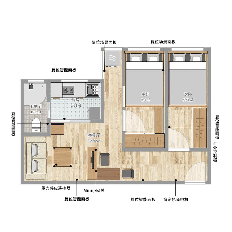 以下為智匯云推薦的兩室一廳基礎(chǔ)智能家居方案: