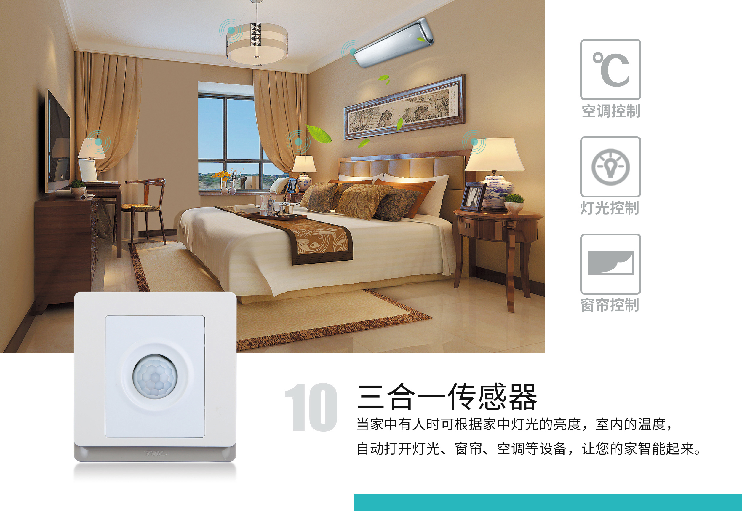 智能開(kāi)關(guān)面板還可以搭配傳感器來(lái)實(shí)現(xiàn)控制,在通道或是床邊安裝傳感器,人經(jīng)過(guò)就可以通過(guò)傳感器的判斷,自動(dòng)打開(kāi)通道及主要區(qū)域的燈光;常見(jiàn)的可作為夜起時(shí)的燈光控制,半夜口渴或是想上廁所時(shí),起床經(jīng)過(guò)床邊的傳感器,就可以開(kāi)啟客廳、廁所及主要過(guò)道的燈光,無(wú)需摸黑去尋找開(kāi)關(guān)面板。