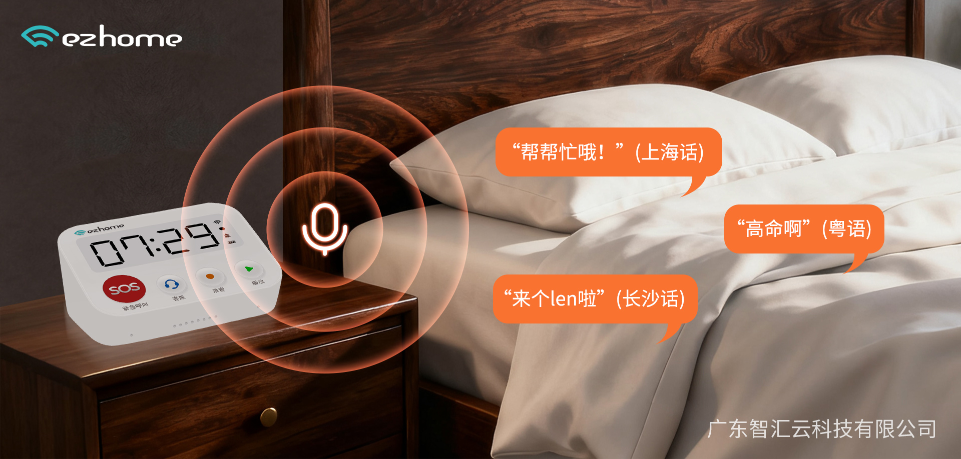 設(shè)備支持一鍵SOS與便捷的語音呼救。只需按下SOS按鍵,或用直接語音喊話都能觸發(fā)求助,操作非常簡單。為進(jìn)一步貼近老人的語言習(xí)慣,產(chǎn)品還設(shè)計(jì)了方言功能,可以精準(zhǔn)識(shí)別包括潮汕話、寧波話、溫州話在內(nèi)的多種方言指令。老人怎么喊,設(shè)備都能聽懂。