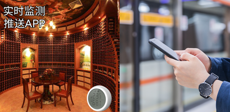 儲(chǔ)酒區(qū)安裝智能溫濕度感應(yīng)器,實(shí)時(shí)監(jiān)控儲(chǔ)酒區(qū)溫濕度狀況,并同步推送自手機(jī)APP;